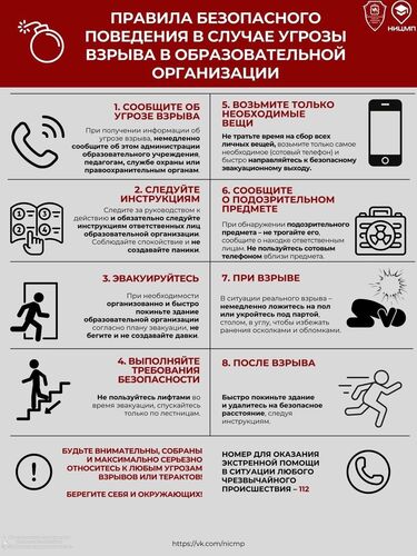 Не допускайте паники, истерики и спешки. Помещение покидайте организованно.